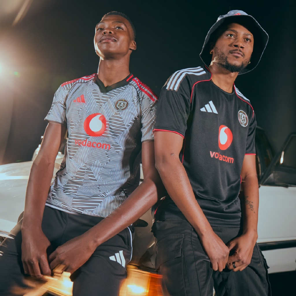 Designed by global sportswear giant Adidas, the latest home jersey embraces the club’s iconic black colours while introducing bold new elements. The standout feature is the sleek red piping that runs along the collar and side panels, offering a modern edge to the traditional design. The kit also features the classic three white Adidas stripes on the shoulders and the prominent Vodacom sponsor logo emblazoned across the chest.