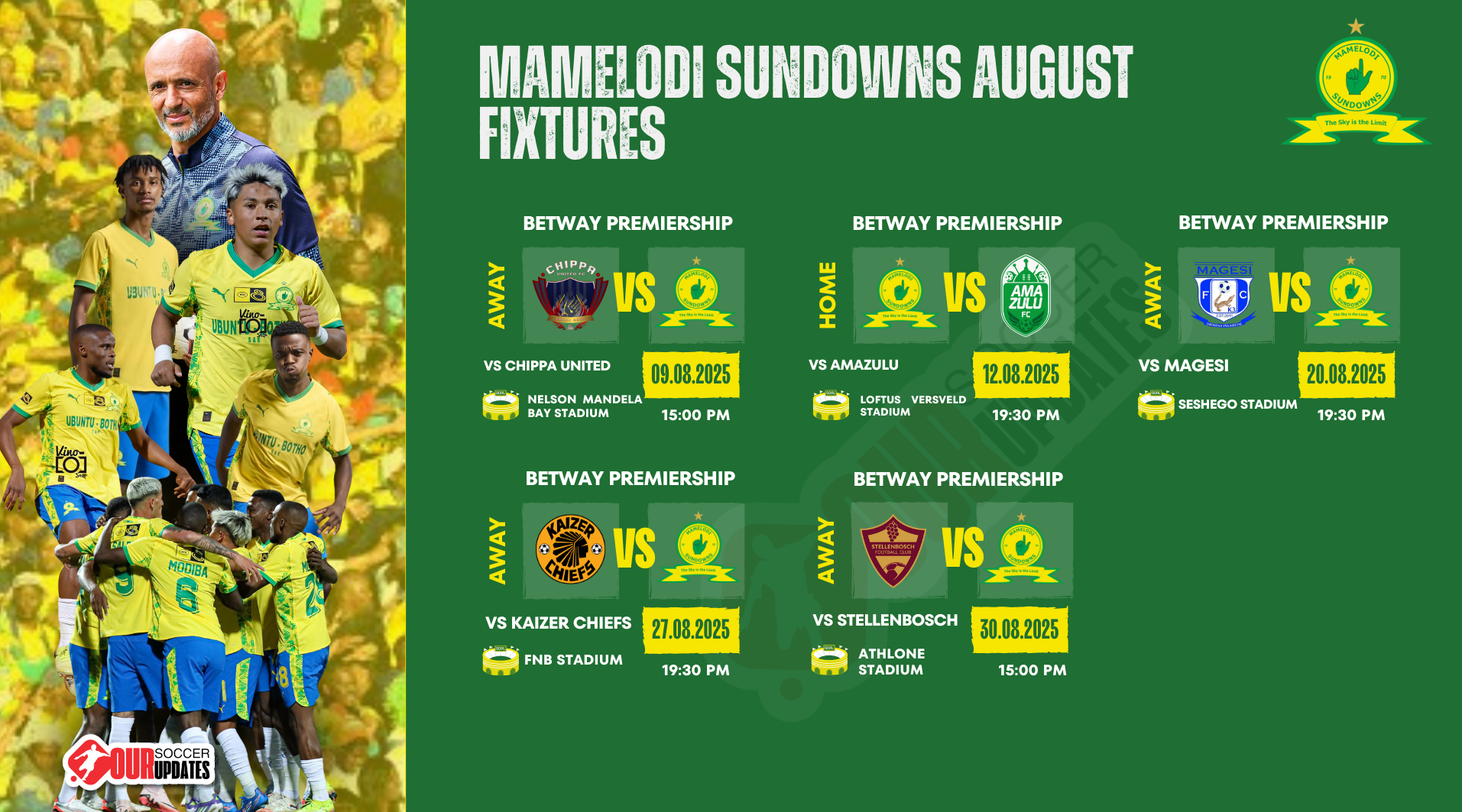 The Betway Premiership 2025/26 season officially kicks off today, Saturday, 9 August 2025, with six exciting matches set to light up stadiums across South Africa. Fans are eager to see their favorite teams back in action as the new campaign begins in earnest. Here are the fixtures for the opening Saturday 09 August 2025: The […]